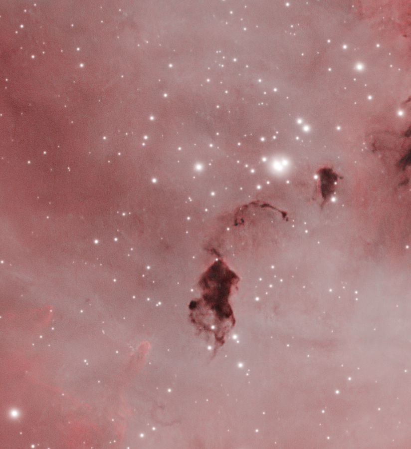 The nebula contains several prominent dark dust lanes and pillars that visually divide its bright emission regions. These fine structures are shaped by the intense radiation and stellar winds from newly formed massive stars, which erode and sculpt the surrounding interstellar material into intricate and irregular patterns.